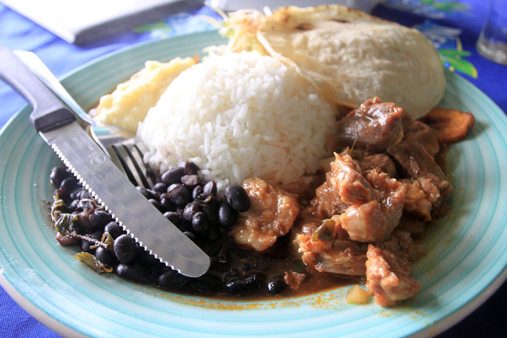 Casado, meaning 'married' in Spanish, is named for the combination sides served together. Starting with a choice of meat (beef, pork, chicken or fish), casado comes with rice, beans and a small shredded cabbage salad dressed with lemandarin fruit (a hybrid between lemon and mandarin). It also comes with an extra side that can be anything from a picadillo (ground beef mixed with diced squash/vegetables, and chopped onions, red bell pepper), to mashed potatoes, french fries or broccoli.