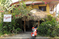 A thatch patio, borders the yellow, Caribbean style-two story home that serves as Deelite's ice cream shop; only steps away from the beach in Puerto Viejo and the bust station.