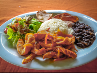 Chicken & Pork fajitas, white rice, beans, chips (potatoes, cassava or plantain) and salad.