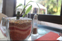 A modern restaurant with dark cherry laminated tables big enough for large groups, sand art centerpieces, and an intimate patio.